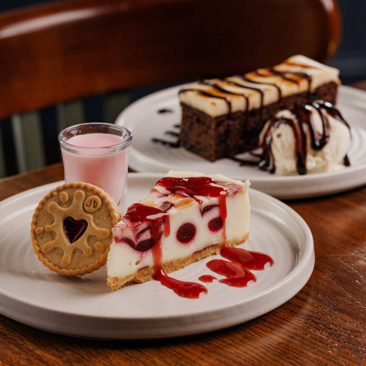 Jammie dodger cheesecake, raspberry & cherry cheesecake topped with almonds, with a boozy raspberry shot on the side (contains alcohol) (v) | 6.79 601 kcals